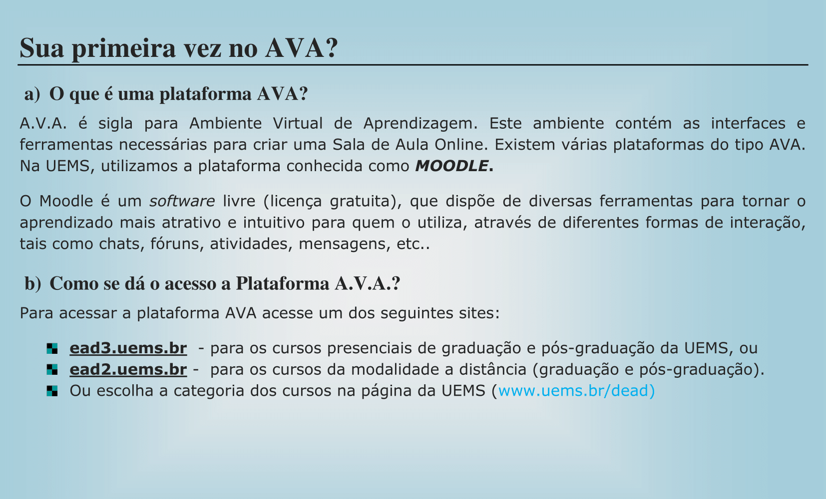 A AVA é sigla para Ambiente Virtual de Aprendizagem, este ambiente contém as interfaces e ferramentas necessárias para criar uma Sala de Aula Online. Existem várias plataformas do tipo AVA, o utilizado na DEaD-UEMS é conhecido como Moodle. O Moodle é um software livre (licença gratuita), que dispõe de diversas ferramentas para tornar o aprendizado mais atrativo para quem utiliza, através de diferentes formas de interação, como ferramentas simultâneas, como chats e atividades assíncronas, como fórum, mensagens e demais recursos.