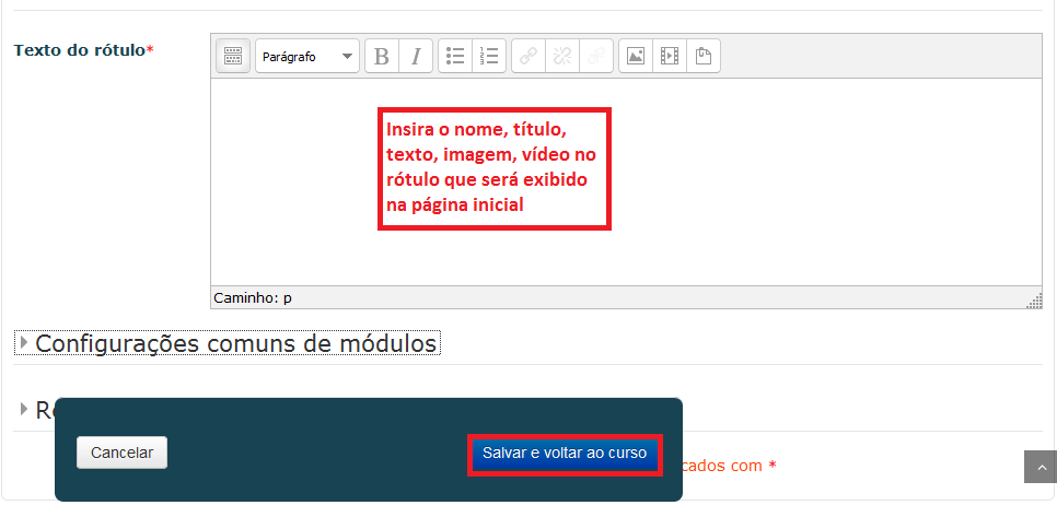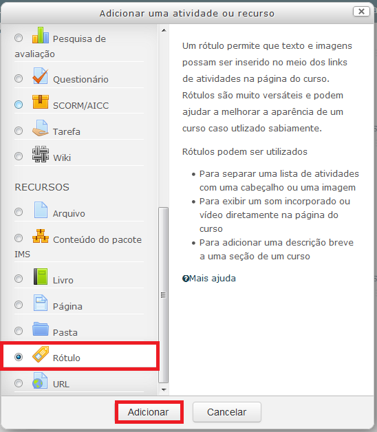 Este recurso permite inserir textos, imagens ou tabelas, como indicativos organizadores das semanas, tópicos ou parte inicial do curso/disciplina, como um título ou subtítulo do módulo na área de trabalho. A diferença para outros recursos é que este não ficará caracterizado como ícone nem possuirá um link. Como Mostrado no Tópico 4.1 ative a edição e adicione o recurso de Rótulo.