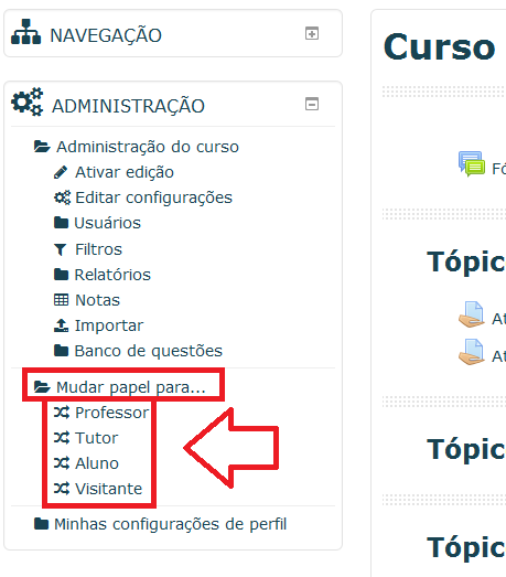 O próximo item do bloco Configurações é a função Mudar papel para, que possibilita ao professor verificar como será apresentada a sua área de trabalho na visão do aluno e, se necessário, tutor. Como na imagem.