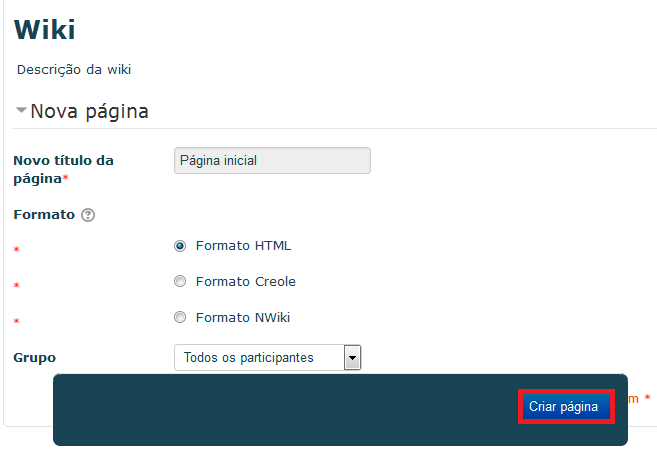 A atividade wiki permite que os participantes trabalhem juntos, adicionando novas páginas web (links de endereços de internet e de arquivos associados), completando e/ou alterando o conteúdo das páginas publicadas.
